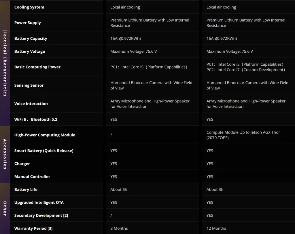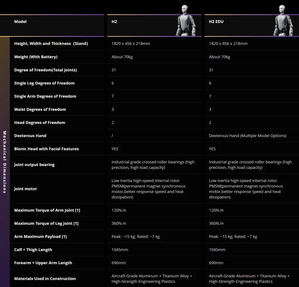 De constructie bestaat uit lichtgewicht materialen zoals aluminium en titanium, gecombineerd met industriële lagers voor hoge belastbaarheid. Met een batterijcapaciteit van circa 0,97 kWh (±3 uur gebruik), een Intel-gebaseerd computeplatform en optionele AI-modules tot 2070 TOPS, biedt de H2 krachtige onboard verwerking. Sensorisch beschikt hij over een binoculaire camera, microfoonarray en draadloze connectiviteit (WiFi 6, Bluetooth 5.2).
