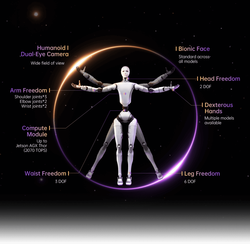 De Unitree H2 is opgebouwd rond een humanoïde kinematica met 31 vrijheidsgraden, verdeeld over benen, armen, romp en hoofd, wat zorgt voor zeer nauwkeurige en vloeiende bewegingen. De robot maakt gebruik van high-performance PMSM-motoren met een maximaal koppel tot 360 Nm in de benen en 120 Nm in de armen, geschikt voor dynamische taken en stabiele locomotie.